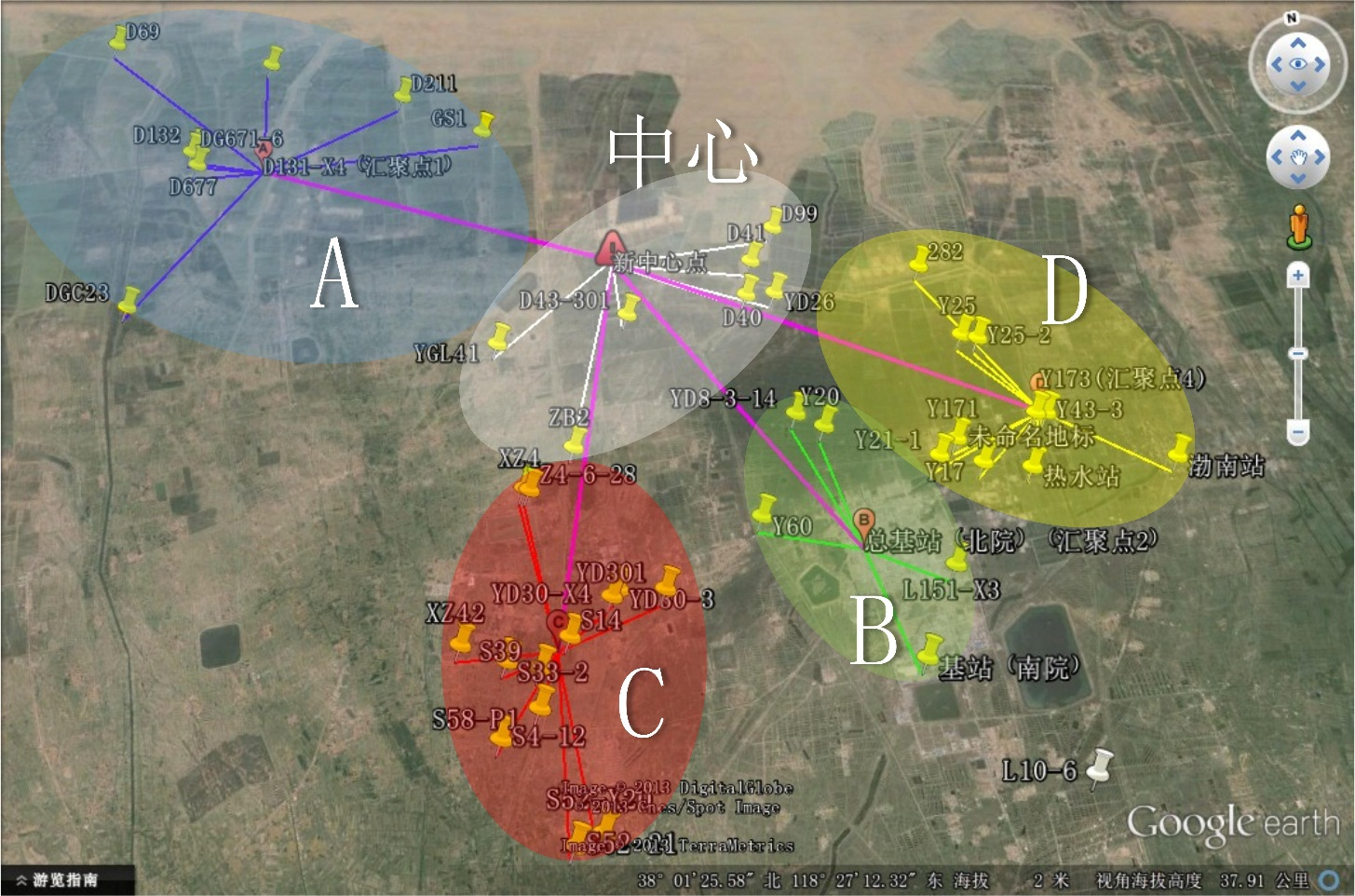 本次方案將整體區(qū)域劃分為5大區(qū)域,油井監(jiān)控70點(diǎn)位計(jì)算。將原有油區(qū)辦中心基站,網(wǎng)橋在部分點(diǎn)區(qū)域補(bǔ)點(diǎn)使用。另外每個(gè)區(qū)域采用3臺(tái)90度扇區(qū)無(wú)線網(wǎng)橋組合成360°廣角覆蓋。在每區(qū)域的鏈路匯聚至該區(qū)域匯聚點(diǎn)后傳至新中心點(diǎn)。區(qū)域內(nèi)的每接入點(diǎn)采用智能基站設(shè)備傳輸至匯聚點(diǎn),匯聚點(diǎn)至中心點(diǎn)采用千兆設(shè)備傳輸。具體如下如所示: