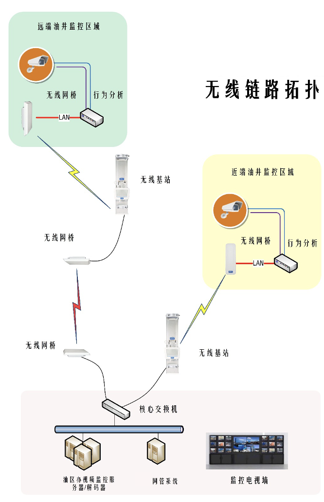 根據(jù)在甲方現(xiàn)場(chǎng)調(diào)研,應(yīng)用環(huán)境在油區(qū)辦360度分布著采油設(shè)備。了解應(yīng)用環(huán)境為固定方式遠(yuǎn)程無(wú)線視頻監(jiān)控進(jìn)行使用,采用無(wú)線基站,無(wú)線網(wǎng)橋覆蓋應(yīng)用場(chǎng)所,覆蓋要求滿足網(wǎng)橋與基站的鏈接,應(yīng)用業(yè)務(wù)主要以視頻為主,在架設(shè)的覆蓋專網(wǎng)內(nèi)承接70余個(gè)視頻監(jiān)控的應(yīng)用,基站架設(shè)可以靈活、高效的實(shí)現(xiàn)數(shù)據(jù),視頻實(shí)時(shí)傳輸,網(wǎng)絡(luò)穩(wěn)定可靠、安全保密,同時(shí)大大減少施工量和施工難度,降低投入成本,也有效降低了今后的管理和維護(hù)成本。
