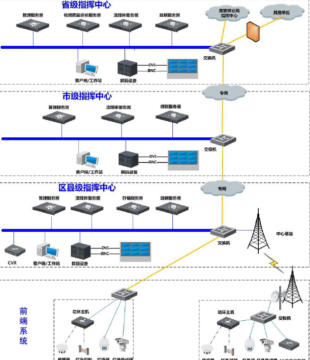 省級(jí)指揮中心部署視頻監(jiān)控平臺(tái)軟件,通過(guò)專網(wǎng)線路連接國(guó)家林業(yè)指揮中心、市級(jí)指揮中心和部分其他單位。市級(jí)指揮中心通過(guò)專網(wǎng)線路分別和省指揮中心以及區(qū)縣級(jí)指揮中心連接,市級(jí)指揮中心部署視頻監(jiān)控平臺(tái)軟件,實(shí)現(xiàn)和省級(jí)及區(qū)縣級(jí)的平臺(tái)進(jìn)行聯(lián)網(wǎng)。區(qū)縣級(jí)指揮中心通過(guò)專網(wǎng)線路連接市級(jí)指揮中心,同時(shí)部署視頻監(jiān)控平臺(tái)軟件和市級(jí)平臺(tái)進(jìn)行聯(lián)網(wǎng)。前端系統(tǒng)通過(guò)光纖線路連接到區(qū)縣級(jí)指揮中心,無(wú)法通過(guò)光纖線路連接的前端系統(tǒng),通過(guò)微波方式連接到區(qū)縣級(jí)指揮中心。