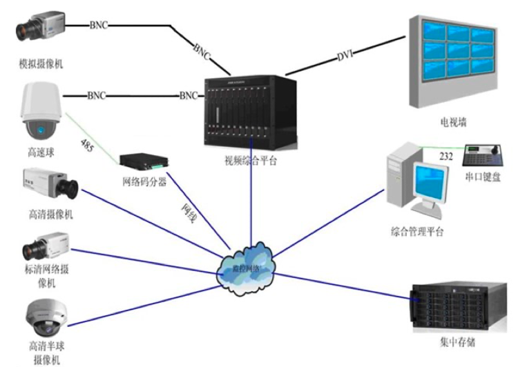 任何規(guī)模、任何形態(tài)、任何階段的視頻監(jiān)控系統(tǒng)都可歸納為:由前端子系統(tǒng)、傳輸子系統(tǒng)、存儲(chǔ)子系統(tǒng)、顯示子系統(tǒng)和控制子系統(tǒng)組成。