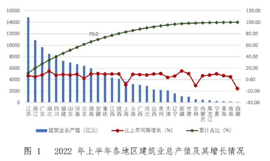 2022年上半年,江蘇、浙江繼續(xù)領跑全國各地區(qū)建筑業(yè),建筑業(yè)總產值雙雙超過1萬億元,分別達到14872.0億元和10866.6億元,分別占全國建筑業(yè)總產值的11.5%和8.4%。
