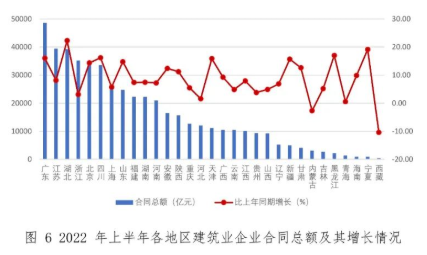 2022 年上半年,廣東、江蘇、湖北、浙江、北京、四川6個地區(qū)建筑業(yè)企業(yè)簽訂合同總額均超過30000億元,分別達到48601.5億元 39419.9億元 392092億元 351917億元、35082.3億元和33563.3億元。