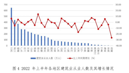2022年上半年,全國建筑業(yè)從業(yè)人數(shù)超過百萬的地區(qū)仍然是13個。江蘇、浙江依然是從業(yè)人數(shù)大省,人數(shù)分別達到647.1萬人和437.9萬人。