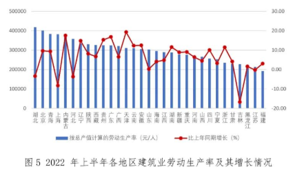 2022年上半年,26個地區(qū)的按建筑業(yè)總產值計算的勞動生產率保持增長。勞動生產率排序前三位的地區(qū)是湖北、北京和青海,分別為417901元/人、401117元/人和383289元/人。