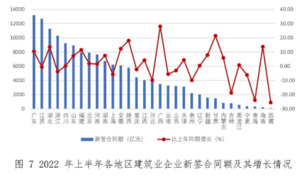 新簽合同額超過6000億元的還有四川、山東、福建、北京、河南、湖南、上海、安徽等8個地區(qū)。新簽合同額同比增長最快的是廣西,達到了 28.0%。