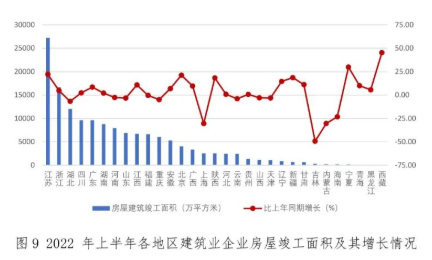 寧夏、江蘇、北京的增幅也都超過了20%。12個地區(qū)房屋建筑竣工面積出現(xiàn)負增長,其中吉林、上海、內蒙古的負增長均超過 30%(圖 9)。