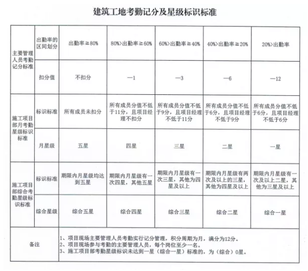 (三)施工現(xiàn)場關(guān)鍵崗位人員考勤實行記分管理,積分周期為月,滿分為12分。次月依據(jù)考勤對象上月出勤率進行記分。